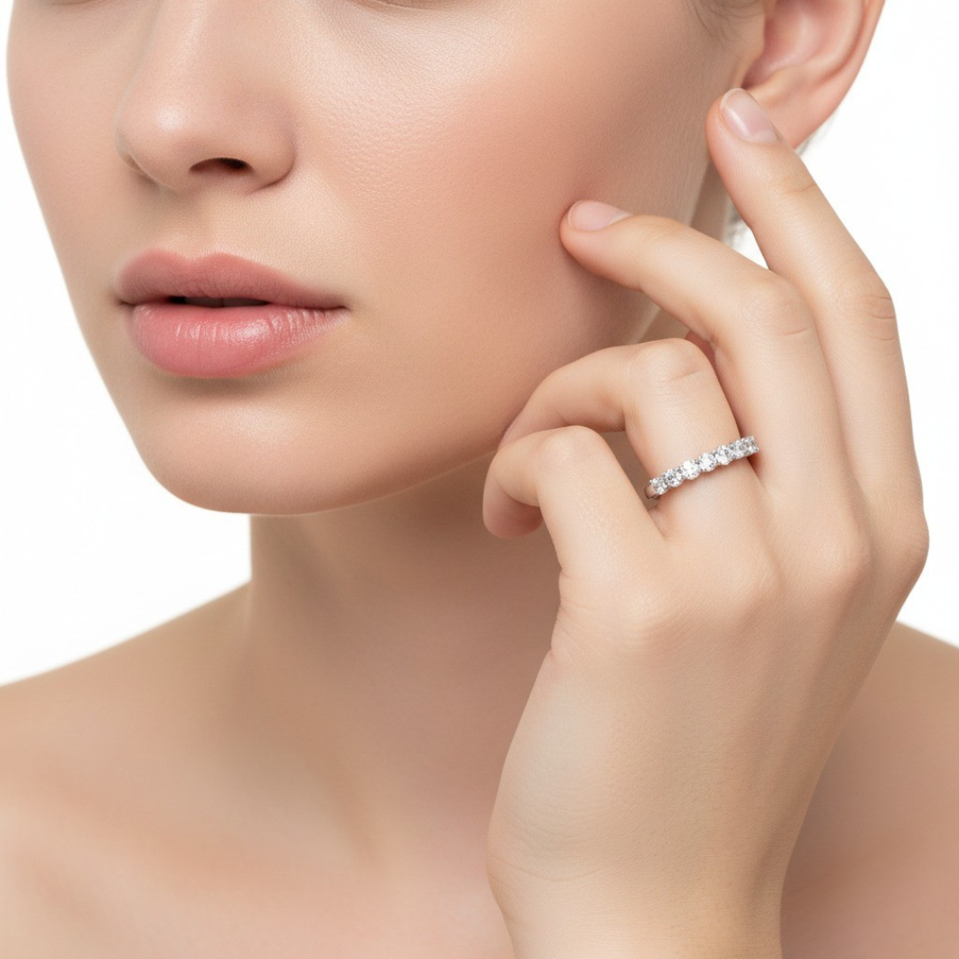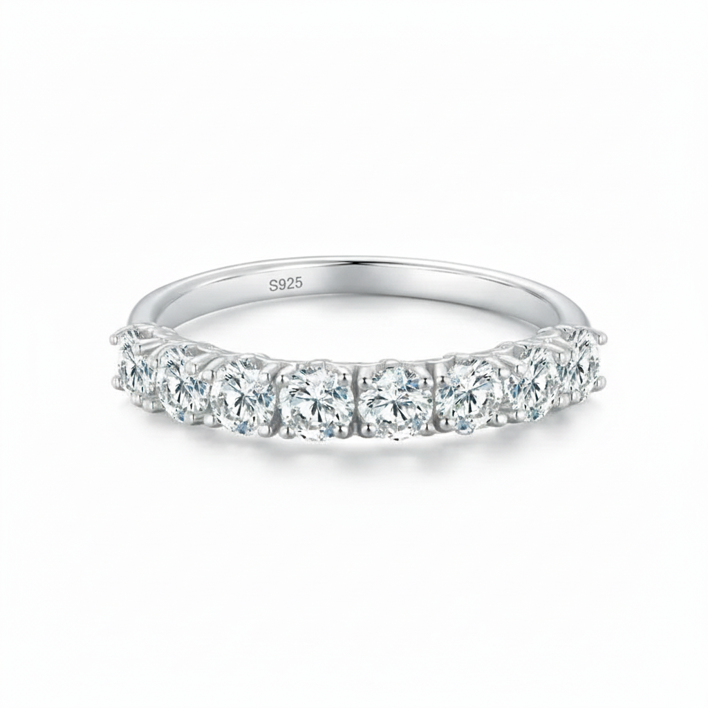 Un anello di fidanzamento raffinato, circondata da 8 pietre laterali  in Moissanite da 0,8 ct ciascuna su una base in argento sterling 925 con placcatura in oro 18K. Il design combina eleganza e luminosità, rendendo questo anello un gioiello perfetto da indossare in ogni occasione speciale.